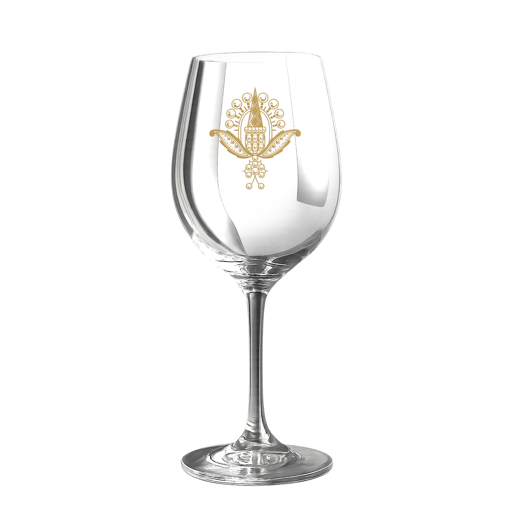 The final detail of the gastronomic journey. The motif is applied to glassware through gold-tinted etching, proving that a well-engineered heritage pattern can scale from a monumental wall to a delicate crystal glass.