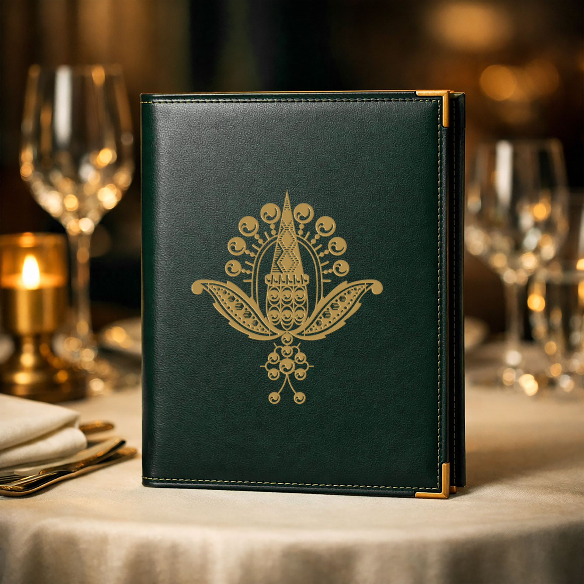 The tactile experience of the table. A deep green leather menu featuring gold-leaf embossing of the 1880 motif. This piece bridges the gap between the monumental architectural environment and the guest’s personal interaction, ensuring the heritage story is literally in their hands.