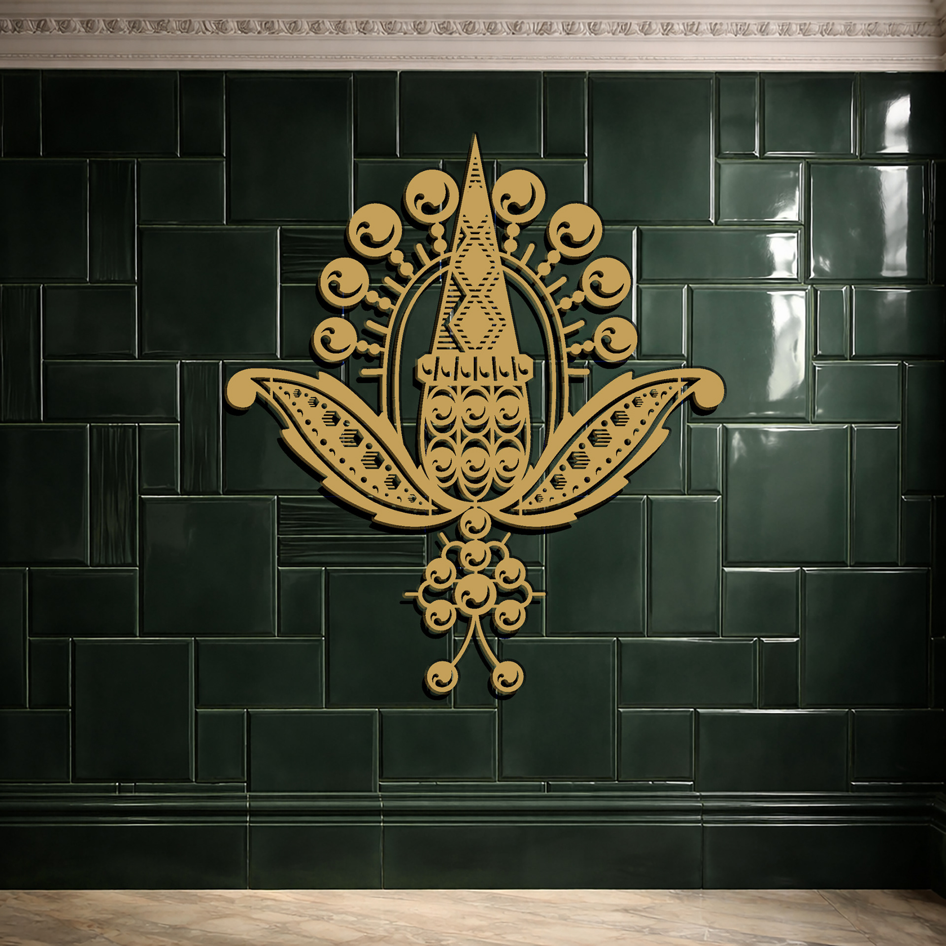 This third chapter explores the dramatic intersection of heritage and industrial materiality. By shifting the 1880 French motif into a palette of deep Malachite and Burnished Brass, the design moves from the decorative into the structural. This collection is a study of how historical patterns can be etched, cut, and embossed onto noble materials to define the identity of a luxury restaurant.